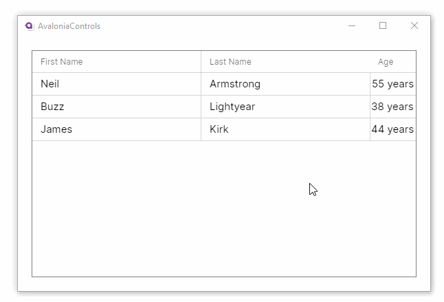 A DataGrid can contain multiple data grid columns and Avalonia has two built-in column types which can be used to display a different data types, and a template type that can customise the column appearance.