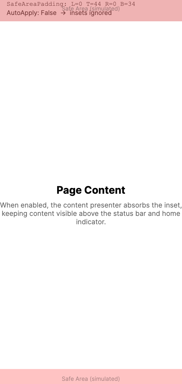 AutomaticallyApplySafeAreaPadding | bool | true | When true, platform safe-area insets (notch, status bar, home indicator) are automatically applied as padding to the content presenter. Set to false for full-bleed designs such as maps or splash screens. |