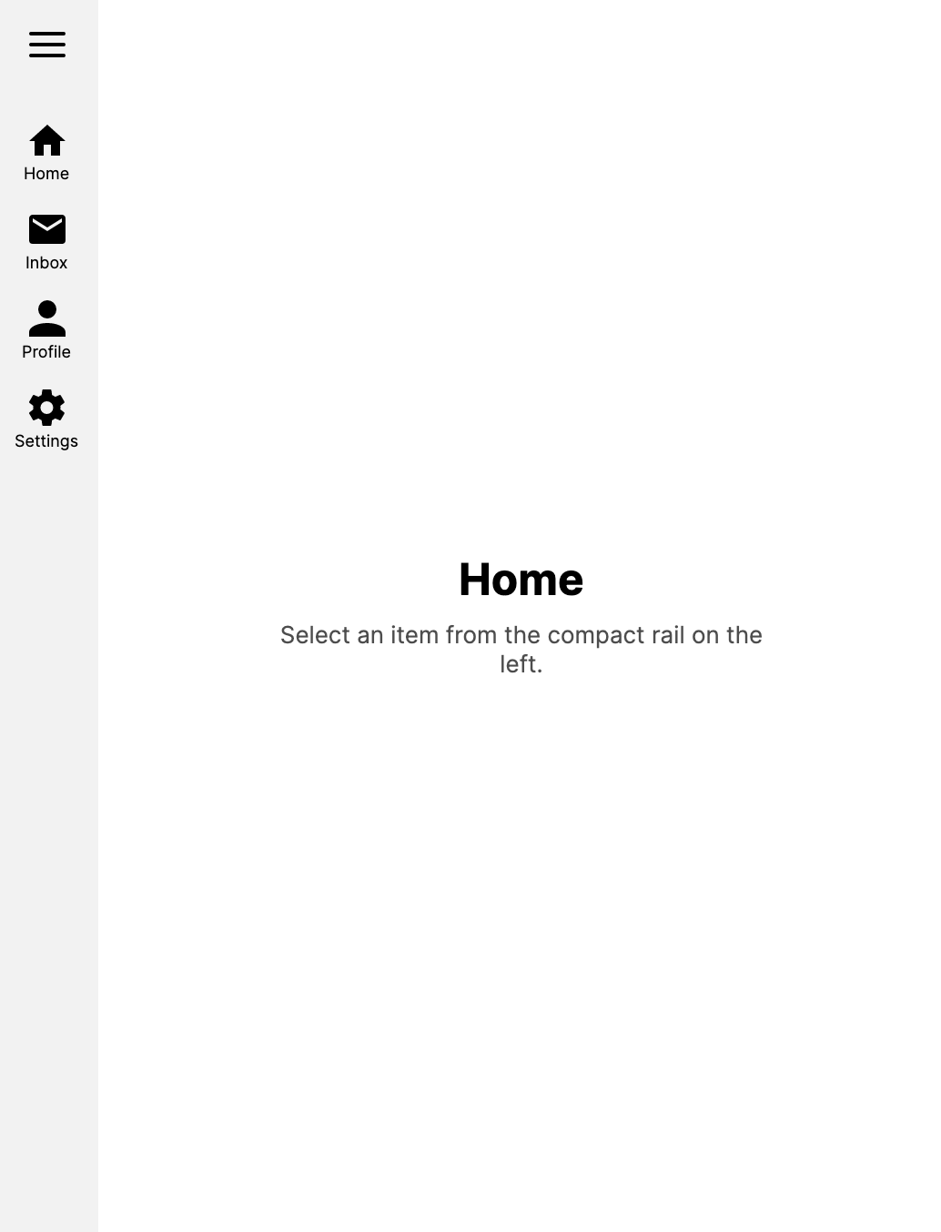 A narrow icon strip is always visible. Tapping or swiping it opens the full drawer. In CompactInline mode, the content is pushed aside when expanded. In CompactOverlay mode, the expanded drawer overlays the content instead.